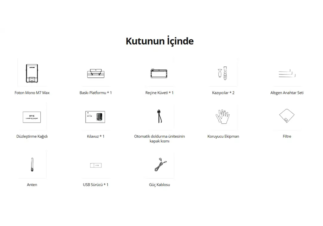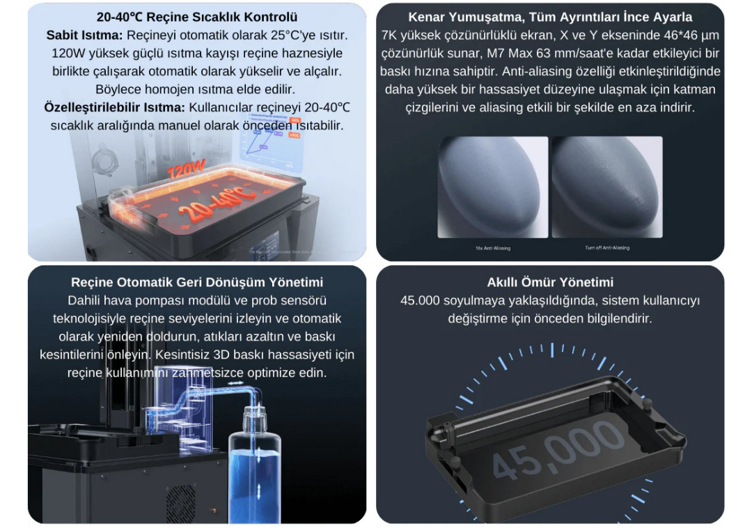 VarAnycubic Photon Mono M7 Max, profesyonel reçine baskı kalitesini büyük hacimli ve yüksek çözünürlüklü bir tasarımda sunan gelişmiş bir MSLA 3D yazıcıdır. 13.6” 7K Monochrome LCD ekranı ve 298 × 164 × 300 mm baskı alanı ile detaylı ve büyük modellerde üstün performans sağlar. COB ışık kaynağı ve Fresnel lens ile homojen ışık dağılımı sunar, 0.01 mm katman hassasiyeti ve 4500 μW/cm² ışık yoğunluğu sayesinde yüksek detay kalitesi elde edilir. Anycubic Slicer, CHITU ve Lychee yazılımlarıyla uyumludur. Hızlı, suyla yıkanabilir ve ABS benzeri reçinelerle çalışabilir. Standart veya yüksek hızlı baskı seçenekleri ile prototipten üretime kadar birçok alanda ideal çözümdür.